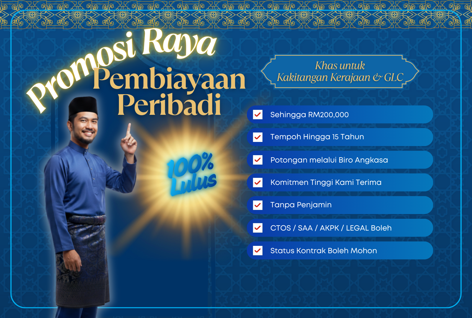Kami menawarkan pelbagai pakej pembiayaan peribadi yang direka khas untuk memenuhi keperluan unik kakitangan kerajaan dan GLC: